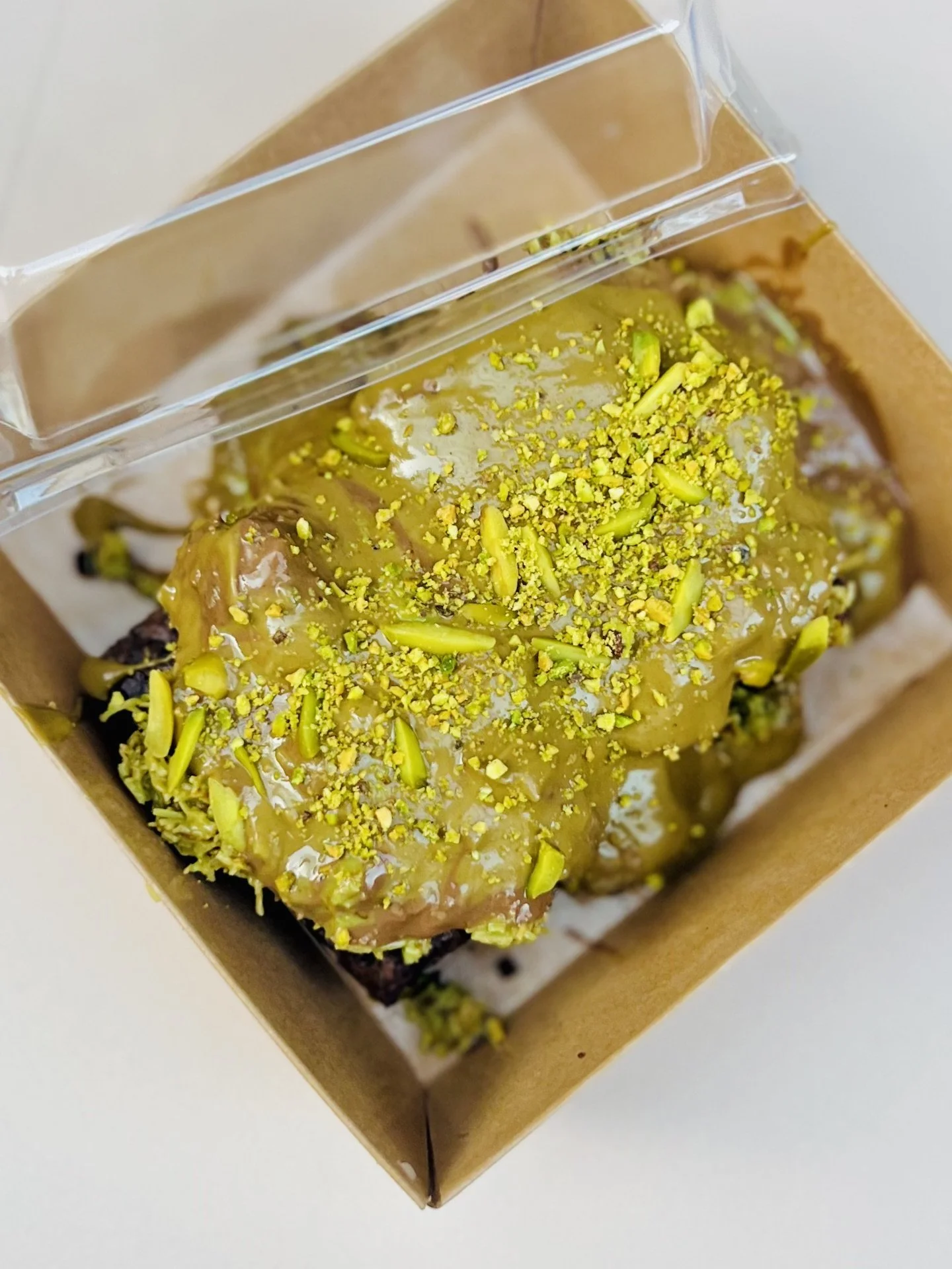 Decadent chocolate brownie topped with pistachio kataifi and topped with chocolate