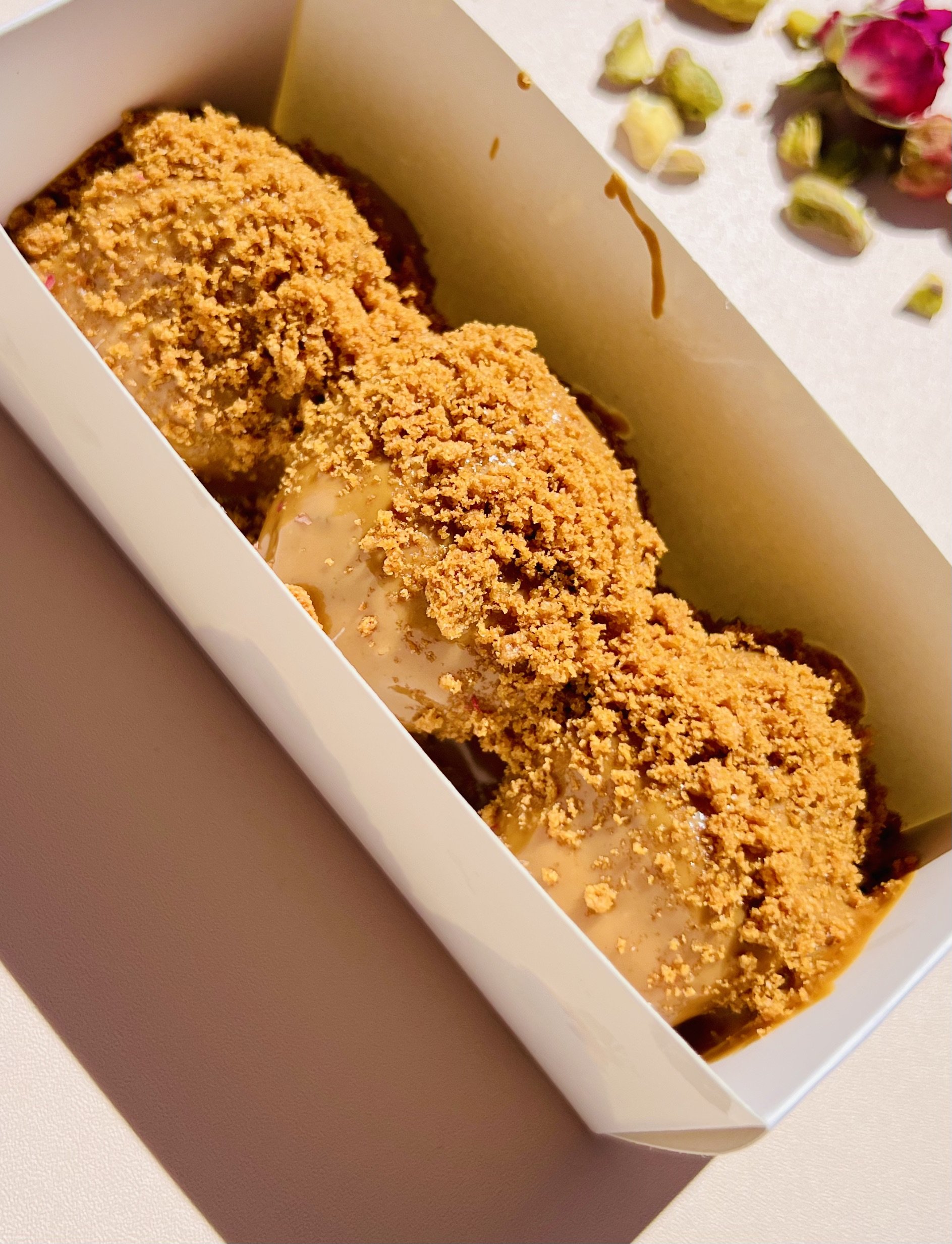 Soft, warm, and syrupy — these golden dough bites are a beloved East African favorite enjoyed around the world, also known as luqaimat, awama, or puff puff. Coated in a sweet glaze and topped with your choice of rose, biscoff, pistachio, or chocolate.